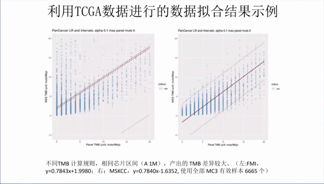 中檢院利用TCGA數據進行的TMB數據擬合,可以發現,不同TMB計算規則,相同芯片區間,產出的TMB差異較大。