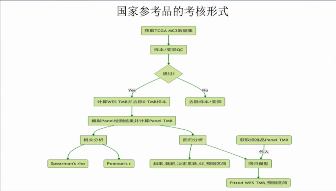 國家參考品的考核形式:獲取TCGA MC3數據集,計算WES TMB并去除0-TMB樣本,最后是6,701個樣本,然后模擬panel檢測結果并計算panel TMB值,相關分析包括P和S系數;然后建立回歸分析方程,再將獲取的標準品panel TMB值代入回歸方程,計算WES TMB的預測區間(90%),如果你的WES TMB值落入在預測區間中,那么你的TMB檢測是準確的。