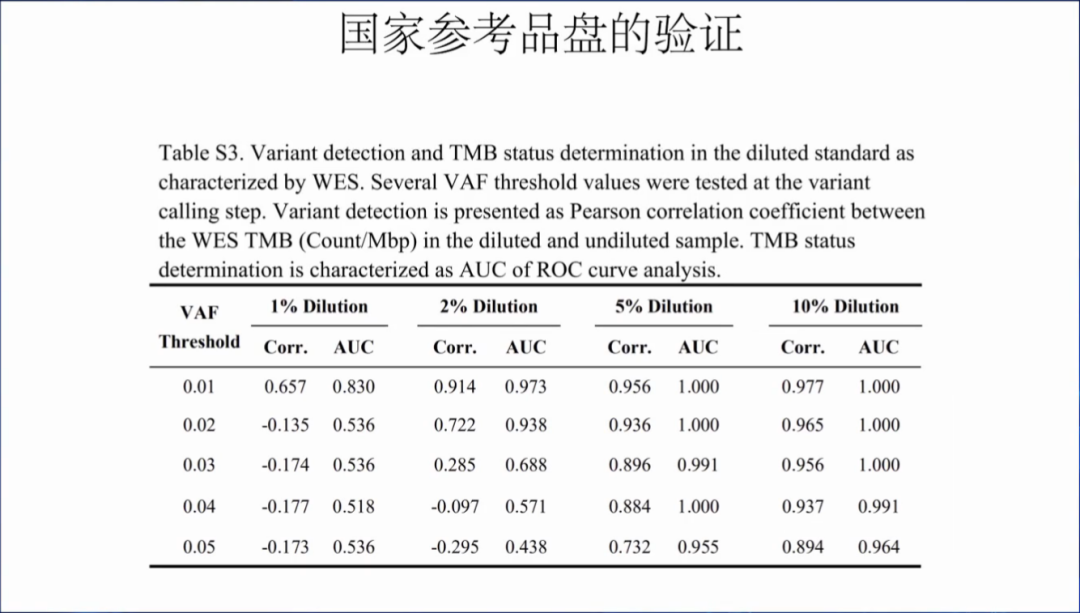 國家參考品盤的驗證結果,AF為1%,2%,3%,4%和5%,腫瘤細胞含量為1%,2%,5%和10%,主要提醒大家在開發的時候需要注意自己檢測產品的AF閾值。