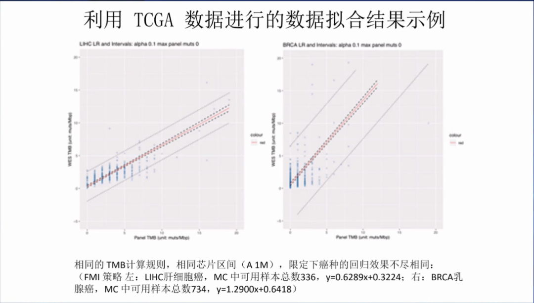 此外,中檢院使用相同的TMB計算規則,發現在相同的芯片區間,限定下癌種的回歸效果也不盡相同。